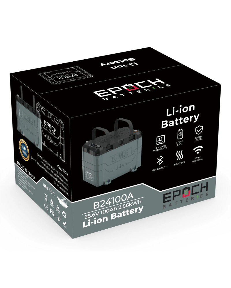 The Epoch Batteries 24V 100Ah Heated Bluetooth LiFePO4 Battery is a high-performance deep-cycle lithium iron phosphate (LiFePO4) battery designed for demanding power applications — from marine and RV systems to solar energy storage, off-grid setups, and trolling motors. Built for reliability, safety, and long life, this advanced battery gives you robust 24V energy with intelligent features and superior durability.