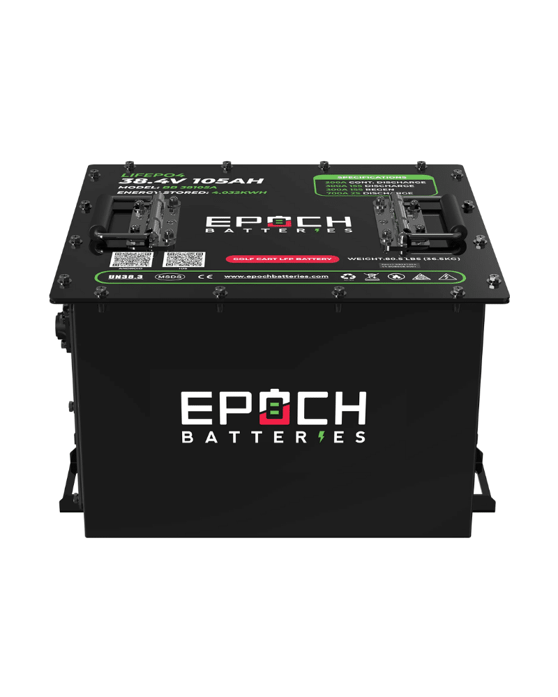 Power your golf cart with the Epoch 36V 105Ah LiFePO4 Battery Complete Kit! Lightweight, long-lasting, and ready-to-install, this kit delivers reliable 36V performance with over 3,500 cycles of battery life. Includes a 36V charger, battery gauge, and 12V DC-DC converter, plus Bluetooth monitoring for real-time battery health. Compatible with most 36V golf carts (EZGO, Club Car, Yamaha), it’s the smart upgrade for longer rides, faster acceleration, and hassle-free maintenance.
