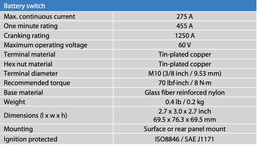 The Battery Switch meets the ISO8846 Ignition Protection standard and is suitable for use in an engine room.