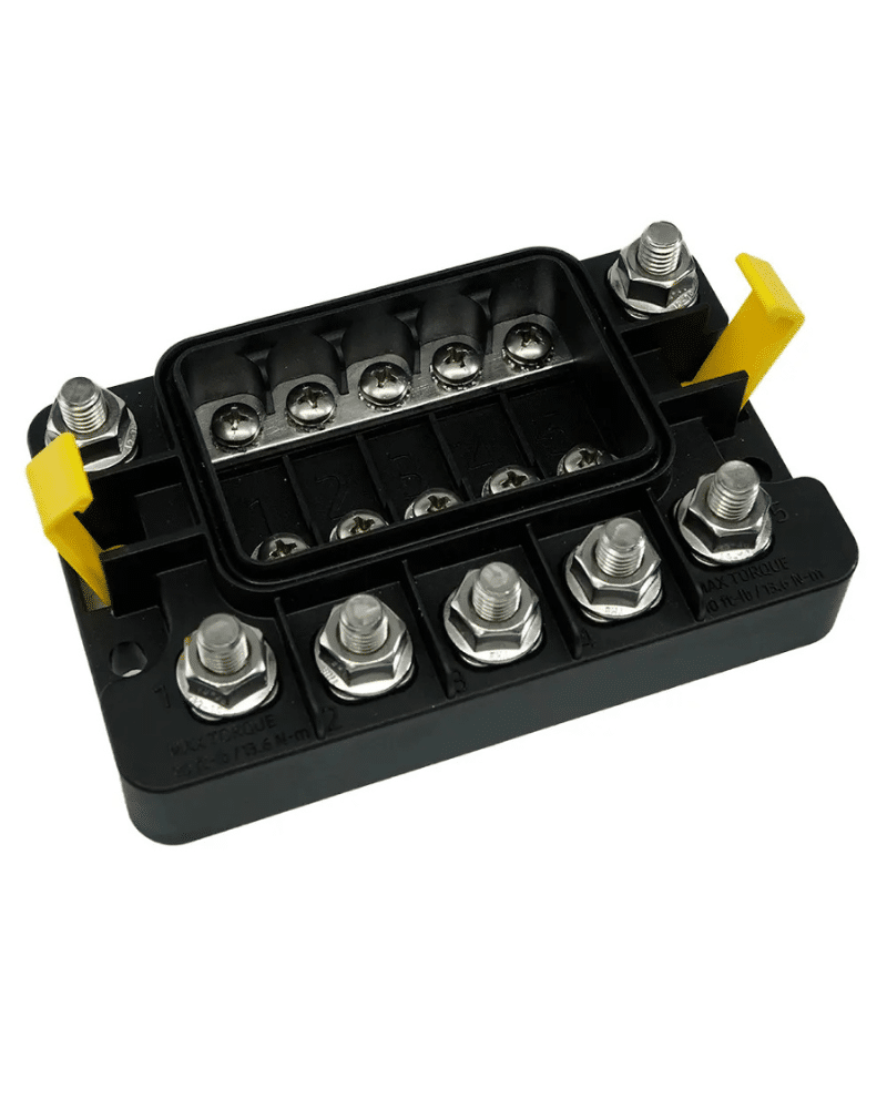 The MIDI 5x Fuse Block with Sealed Cover is designed for high-current power distribution. It accommodates up to five MIDI fuses with M8 input/output studs, ensuring secure and reliable connections. The sealed cover provides environmental protection against dust, water and corrosion, making it suitable for demanding applications such as marine, off-road, and industrial systems.