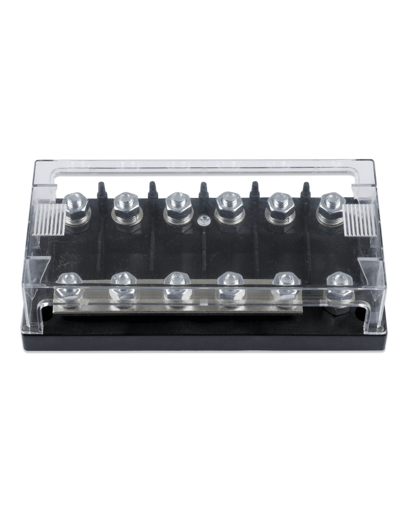 The Victron CIP050060000 is a high-quality 6-way fuse holder designed for MEGA fuses, offering reliable circuit protection and organized DC power distribution in professional and marine electrical installations. It features a solid tin-plated copper busbar and robust ABS base for durability, combined with a clear polycarbonate cover for easy fuse inspection and added safety.