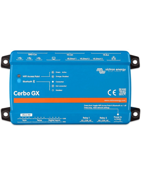 Unlock the power of comprehensive energy management with the Victron Cerbo GX. This cutting-edge device seamlessly integrates into your energy system, providing advanced monitoring, control, and communication capabilities to optimize your power usage like never before. Connect to the Cerbo using Victron Remote Management, the optional touch-screen display (GX Touch 50/70), an MFD or the VictronConnect mobile app. The Cerbo GX is the heart of your solar installation. All other components, like inverter/chargers, solar chargers, and batteries connect to it and the Cerbo ensures they work together in unison.