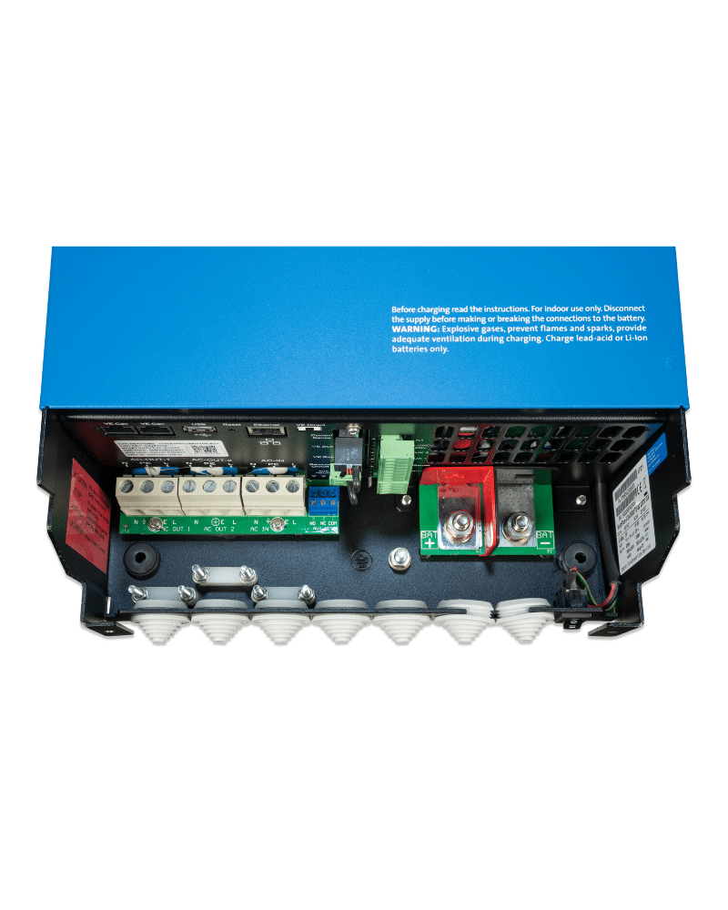 The Victron MultiPlus-II GX is a powerful all-in-one inverter/charger designed for advanced energy systems. With its built-in GX device for seamless monitoring and control, this model combines a 3,000 VA pure sine wave inverter, a 70A high-performance battery charger, and a 32A automatic transfer switch in one compact unit.