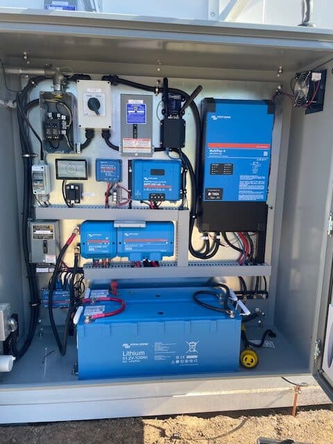 Connectivity inside a metal enclosure presented its own distinct challenge, as metal boxes are effective blockers of both cellular and Wi-Fi signals. Collin Quinn was brought in specifically to solve this, with a clear brief: get both devices online without overbuilding the system. His approach was deliberate and cost-conscious. Rather than specifying separate cellular and Wi-Fi antennas, he found a leaner path. An external Victron Cellular Antenna was routed through a sealed enclosure penetration to reach the nearest cell tower. For the CoolBot, which offers no wired Ethernet option, Collin leveraged the CoolBot Pro’s separate Wi-Fi receiver dongle, positioning it inside the enclosure directly beside the Peplink MAX BR1 Mini router so the router’s own Wi-Fi antennas could communicate with it at point-blank range. The Victron Cerbo GX is wired directly to the router, completing the data loop. A TrekData 2GB Multi-Carrier Roaming Plan handles the cellular link, sized for the site’s modest data needs and strong local coverage.